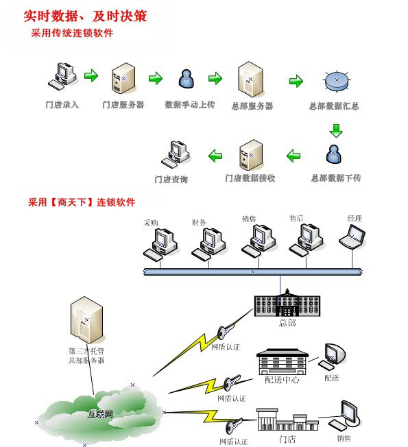 非实时数据,滞后一天;手动传输,速度慢,稳定性差,总部数据依赖于人的自觉性或公司管理制度,数据及时性没有保证;适用于要求不高的小连锁,不适合有发展潜力的大连锁企业。 |